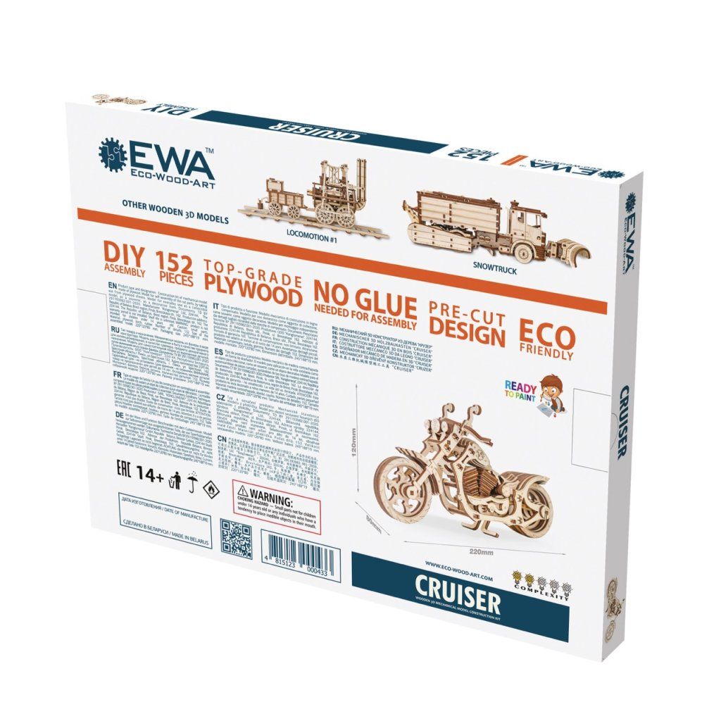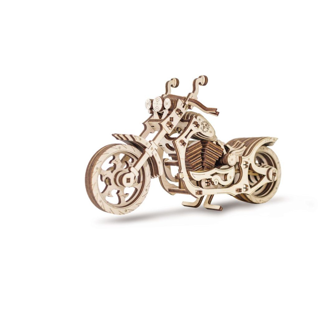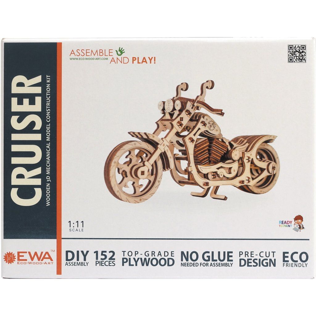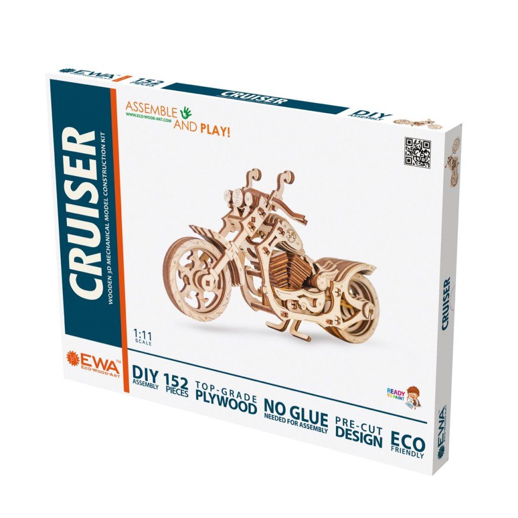 Dřevěná motorka, která opravdu jezdí! Cruiser od EWA má funkční gumičkový motor – stačí odjet dozadu, pustit a sledovat, jak se rozjede. Navíc se otáčí řídítka a sklopí se středový stojan. Tohle není jen model do police – je to hračka, se kterou se budete bavit i po složení.