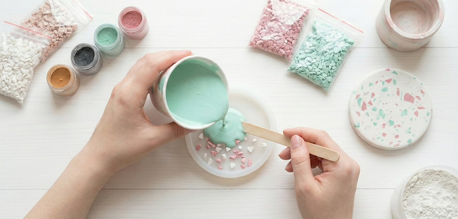 Možná už jste na ně na Instagramu nebo Pinterestu narazili. Nádherné podtácky s efektem terazzo, minimalistické květináče nebo misky na šperky, které vypadají jako z kamene, ale hrají všemi barvami. To není beton ani sádra. Seznamte se s Jesmonite – materiálem, který mění pravidla hry v domácím tvoření.