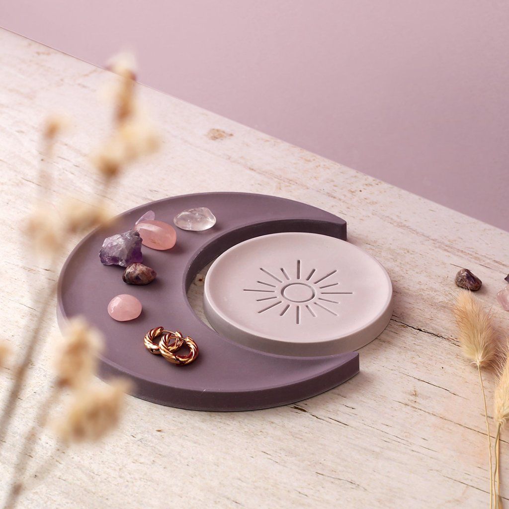 Právě teď začíná vaše tvořivá jízda mezi hvězdy. Sledujte, jak se tekutá hmota pomalu mění v pevný kámen a jak pod vašima rukama ožívají paprsky Slunce a křivky Měsíce. Ten moment, kdy hotové dílo poprvé vyjmete z formy a ucítíte jeho sametově hladký povrch, si prostě zamilujete. Váš set je připravený hlídat vaše prstýnky, oblíbenou svíčku nebo jen tak dělat radost svou přítomností. Tak co, jste připraveni odemknout svou fantazii a rozzářit svůj interiér vlastním dílem?