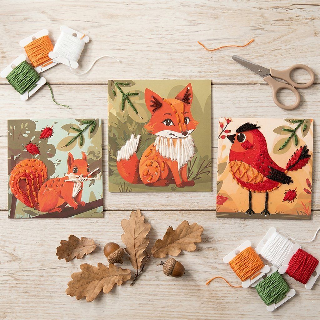 Vyměňte na chvíli tablet za barevnou vlnu a ukažte dětem, že „kreslit“ se dá i pomocí jehly a nitě. Tato vyšívací sada s lesními zvířátky je navržena tak, aby ji zvládly i malé prsty, které se teprve učí trpělivosti. Díky pevným kartám s dírkami a bezpečné jehle vytvoříte plastické obrázky lišky nebo veverky, které budou vypadat skvěle na zdi v dětském pokoji i na poličce u starších sourozenců.